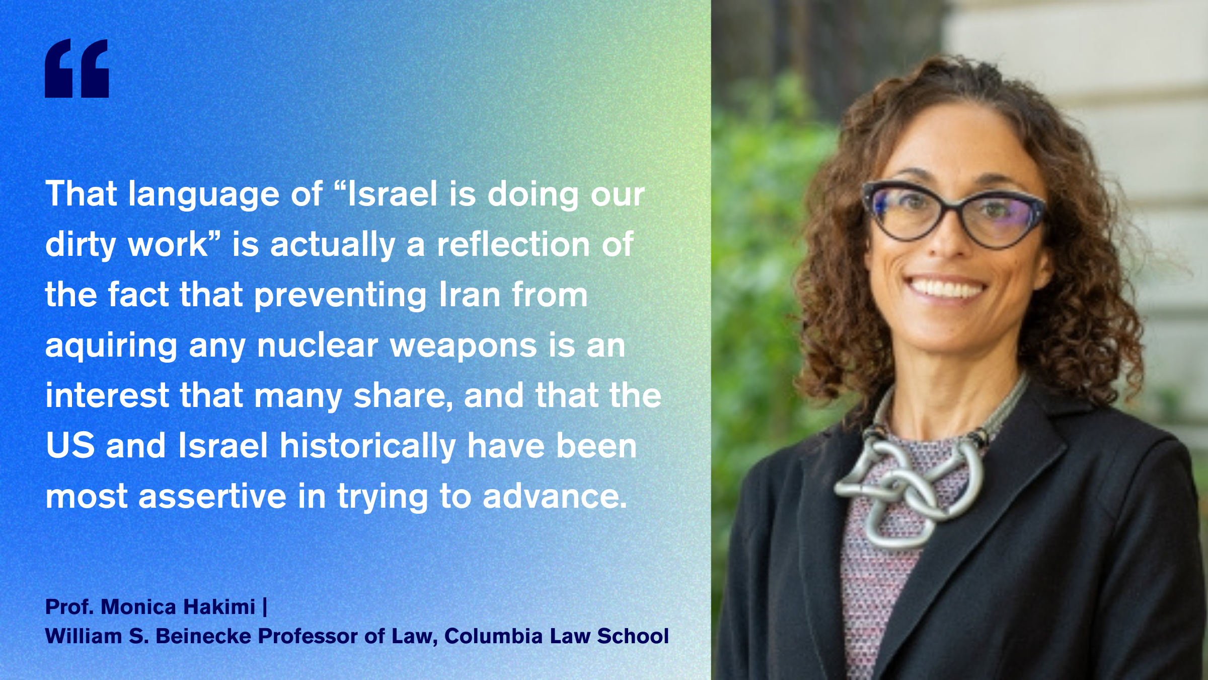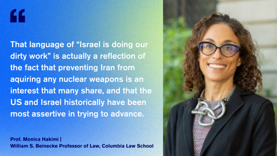 Moderiert von Dr. Iris Sayram, Korrespondentin des ARD-Hauptstadtstudios, sprachen Monica Hakimi, William S. Beinecke Professor of Law an der Columbia Law School, und Michael Kubiciel, Professor für Deutsches, Europäisches und Internationales Strafrecht, Strafprozessrecht, Wirtschafts- und Medizinstrafrecht an der Universität Augsburg, unter anderem über die Bedrohung durch das iranische Atomprogramm, durch das ballistische Raketenprogramm des Regimes, Stellvertreterkriege im gesamten Nahen und Mittleren Osten und die Norm einer Responsibility to Protect.