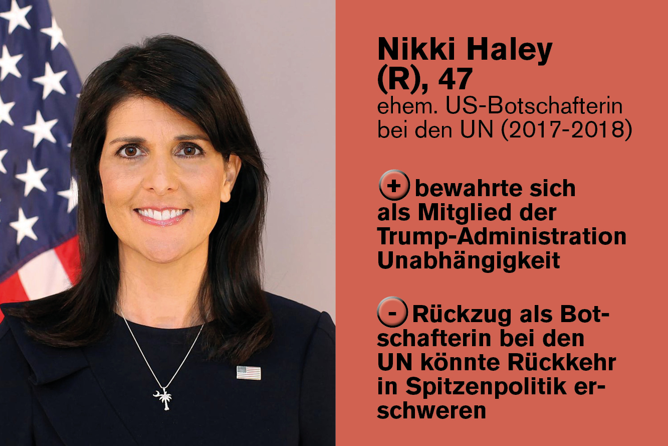 Nimrata, kurz Nikki, Haleys Laufbahn wird oft als kometenhafter Aufstieg beschrieben und dies trotz – oder gerade wegen – ihres Rückzugs vom Posten als Botschafterin. Die Tochter indischer Einwanderer hat während ihrer Amtszeit das Kunststück vollbracht, Teil der Trump-Administration zu sein und sich dennoch einen gewissen Sonderstatus zu erhalten. Zumindest in puncto Öffentlichkeitswirksamkeit hat sie eine außenpolitische Hauptrolle gegenüber ihren Kollegen Tillerson bzw. Pompeo geltend gemacht, nachdem sie selbst Trumps ursprüngliches Angebot des Postens des Secretary of State ausgeschlagen hatte. Tatsächlich hatte sie während des Wahlkampes 2016 erst sehr spät die Wahl Trumps empfohlen. Sie sei, betonte sie, „not a fan“. Auf ihren späteren Dienstreisen an Bord der Air Force One soll andererseits eine enge Freundschaft mit Ivanka Trump entstanden sein.
